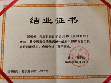 由民革安顺市委选派,经安顺学院党委统战部、《安顺学院学报》编辑部、人文学院等部门同意,郑朝彬于2020年10月19日至23日赴遵义干部学院(中共遵义市委党校)参加了“中共安顺市委统战部统一战线干部综合能力提升培训班”学习。此次培训,采取理论学习加现场教学的方式开展,教学主题鲜明、教学方式新颖,教学内容丰富。通过这次培训,使自己进一步加深了对遵义会议及其精神的认识(甚至可以说是改变了过去对遵义会议及其精神的片面认识),同时也从遵义会议及系列会议的召开及其精神中学习到了许多统战知识。